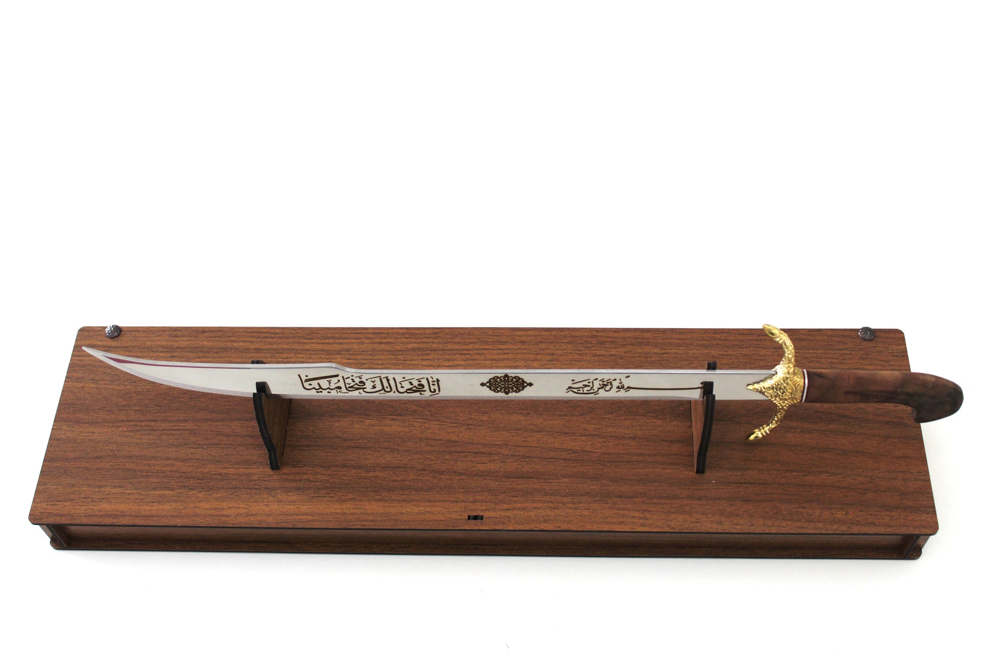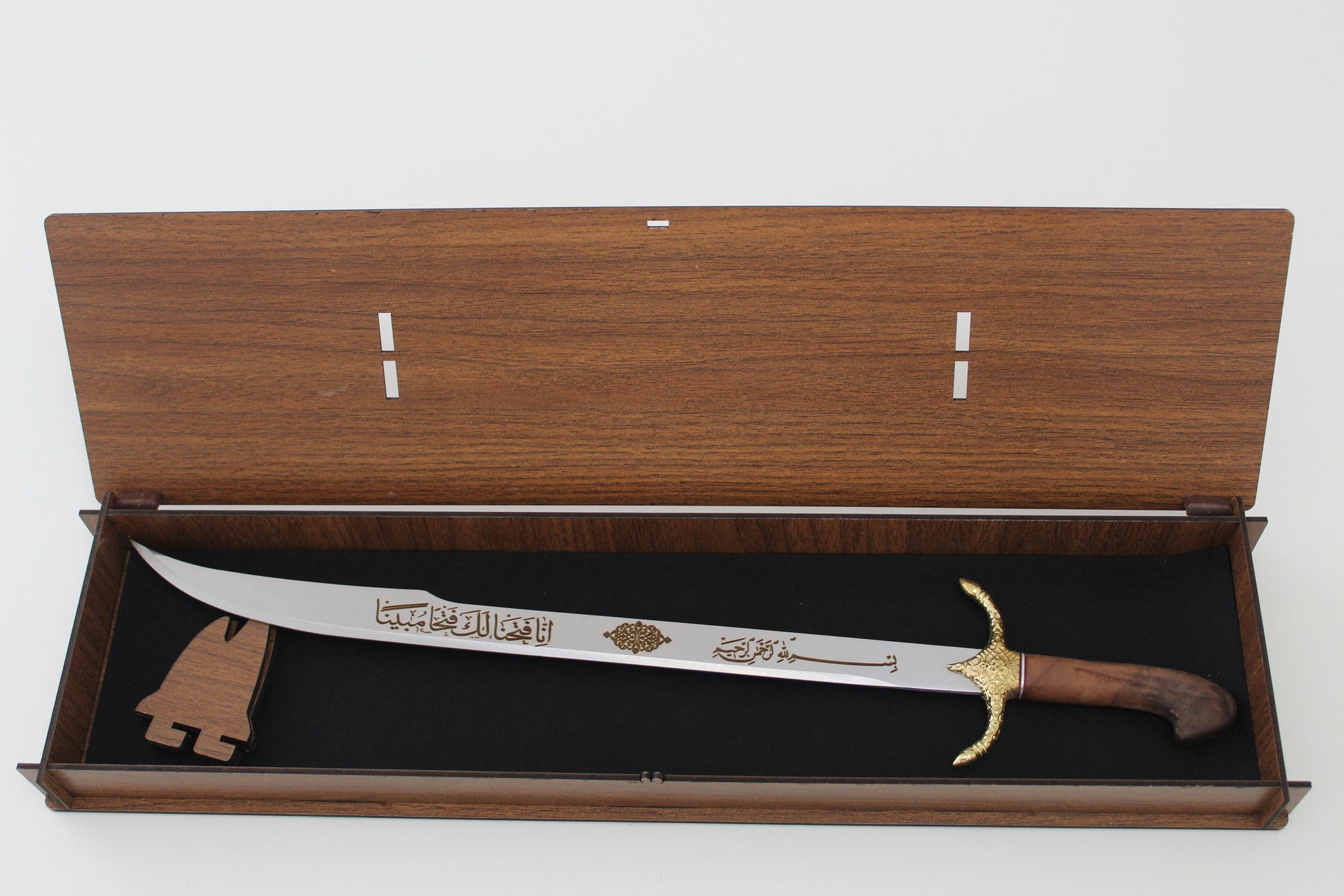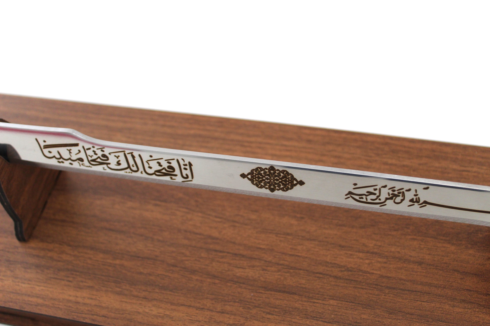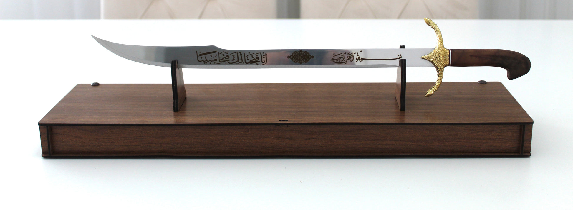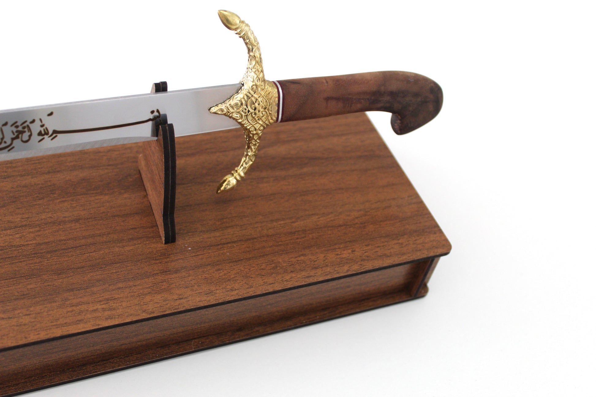Die Klinge ist standardmäßig mit feinen arabischen Gravuren versehen (siehe Fotos). Wenn Sie stattdessen eine blanke Klinge mit nur Ihrer Wunschgravur möchten, geben Sie dies bitte in den Bestellnotizen an.